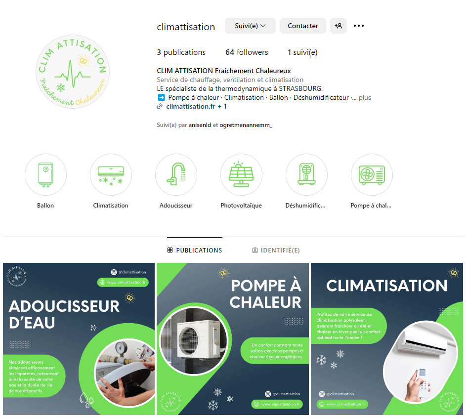 - Création d’icônes pour les stories à la une : ballon, climatisation, adoucisseur, photovoltaïque, déshumidificateur, pompe à chaleur. Cela permet une navigation rapide et intuitive pour les utilisateurs.